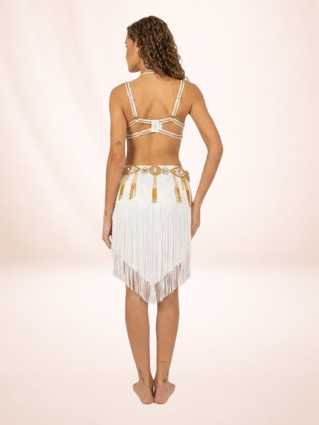 A short blue dance costume decorated with playful fringe that moves with every step. Designed to highlight energy and rhythm, this vibrant piece brings bold flair to your dance look